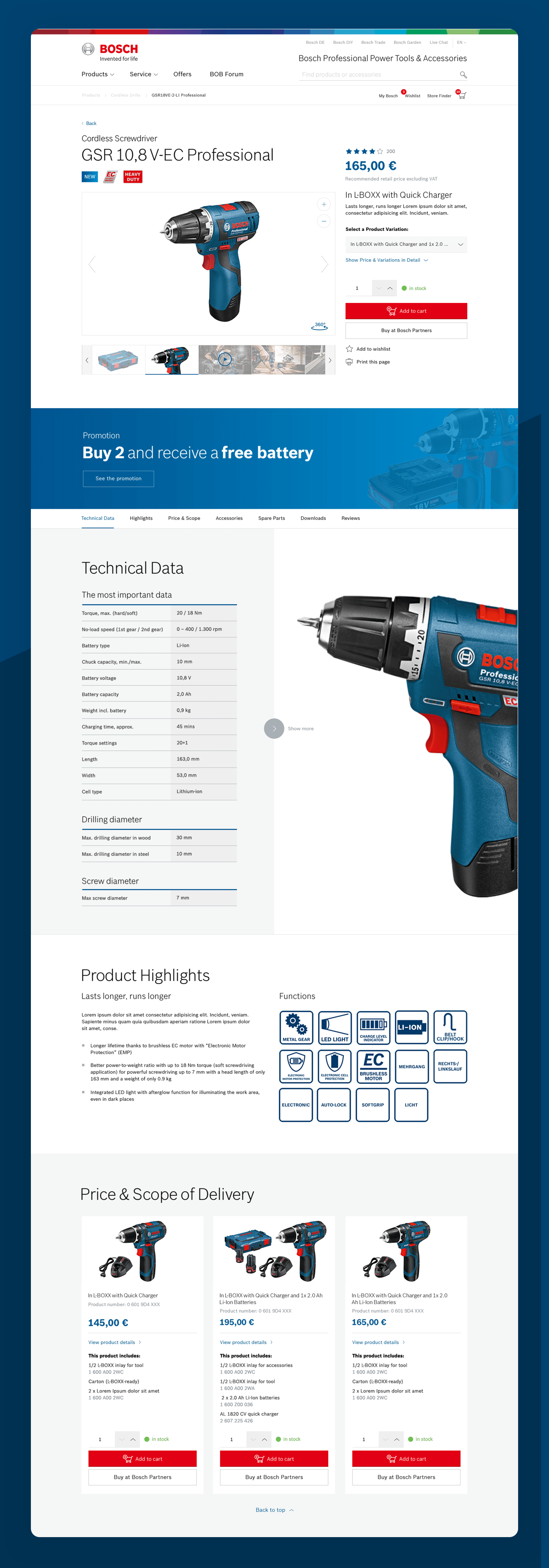 In 2017, Bosch gave all its brands a facelift, including Bosch Professional Power Tools, which equips professional craftsmen and construction workers. As part of this rebranding, the Power Tools website and online shop were completely redesigned and optimized. Our concept helps craftsmen looking for new power tools and matching accessories with a clearer navigation and a quick product and accessory finder. In contrast to an online shop aimed at private consumers, the Bosch Professional shop focuses on product information, comparisons and bulk buyers.